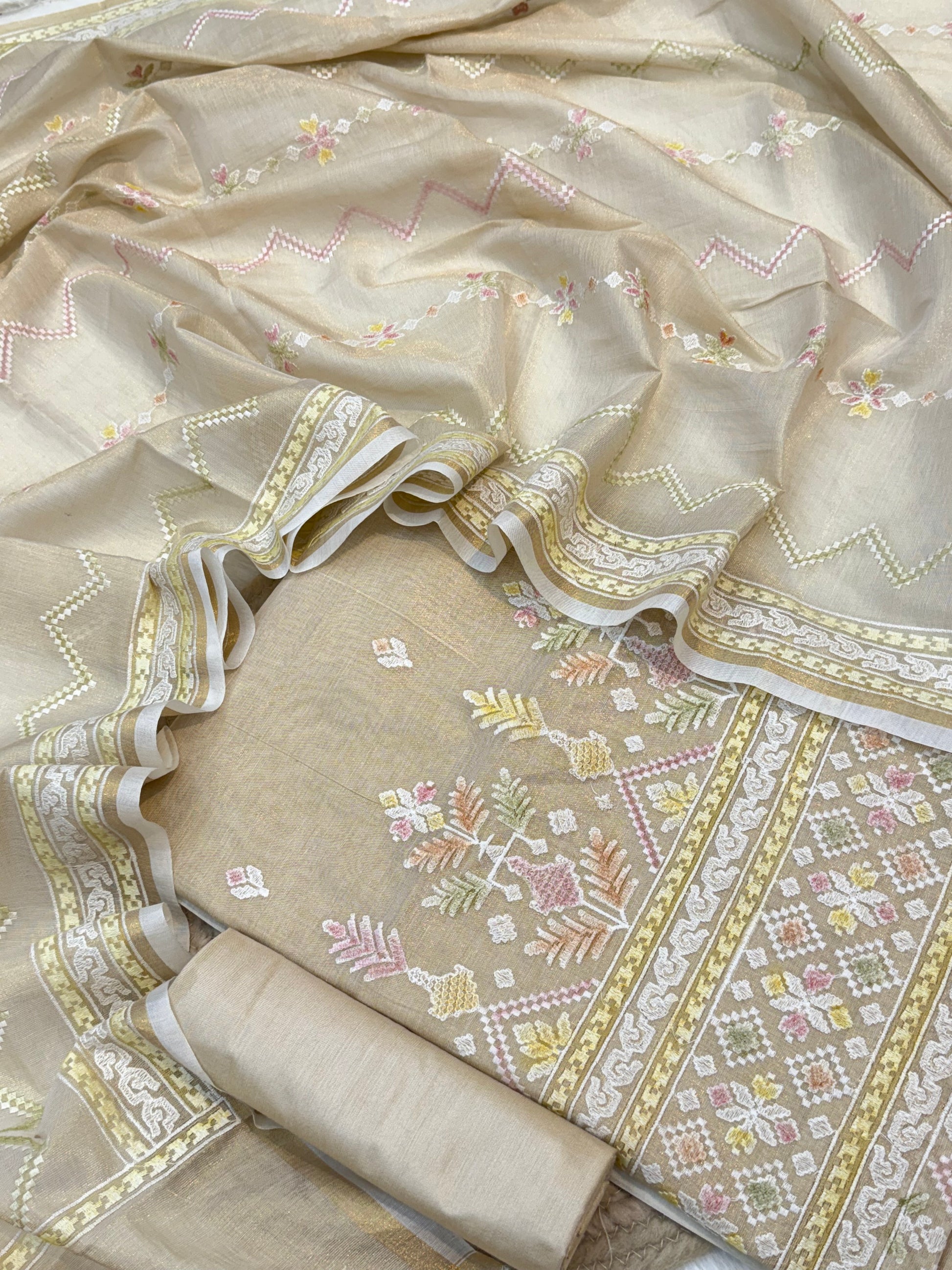 Handwoven in Banaras, this Beige Colour Tissue silk Suit piece is a canvas waiting for your imagination.