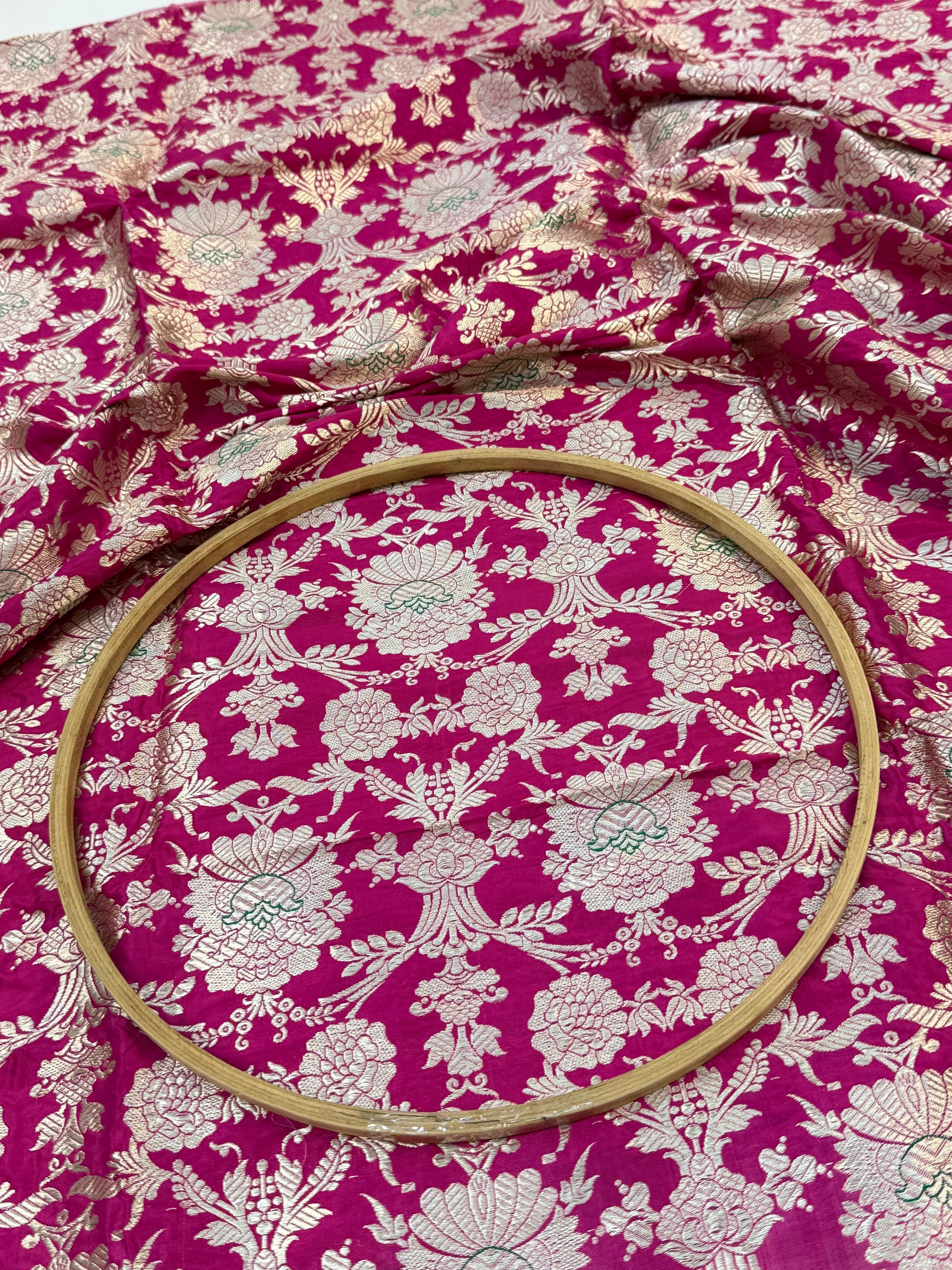 Handwoven in Banaras, this Rani Pink colour Pure Brocade silk Suit piece is a canvas waiting for your imagination.