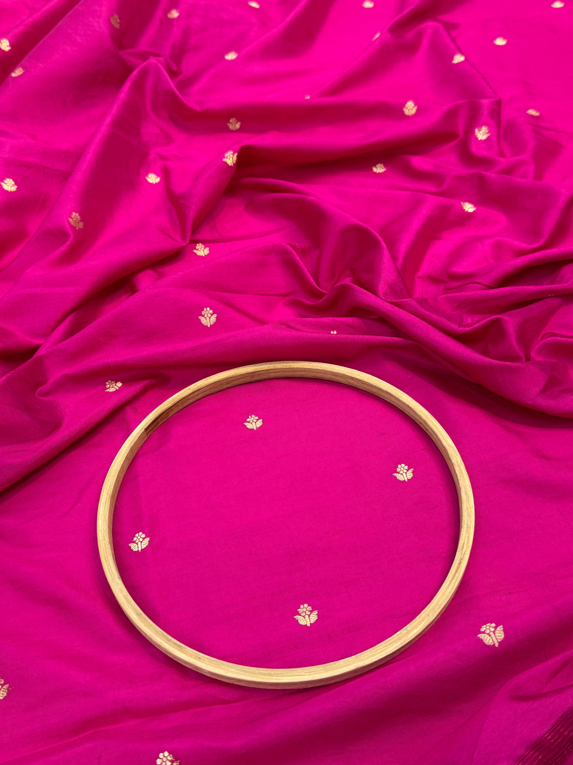 Handwoven in Banaras, this Rani Pink colour Katan Suit piece is a canvas waiting for your imagination.