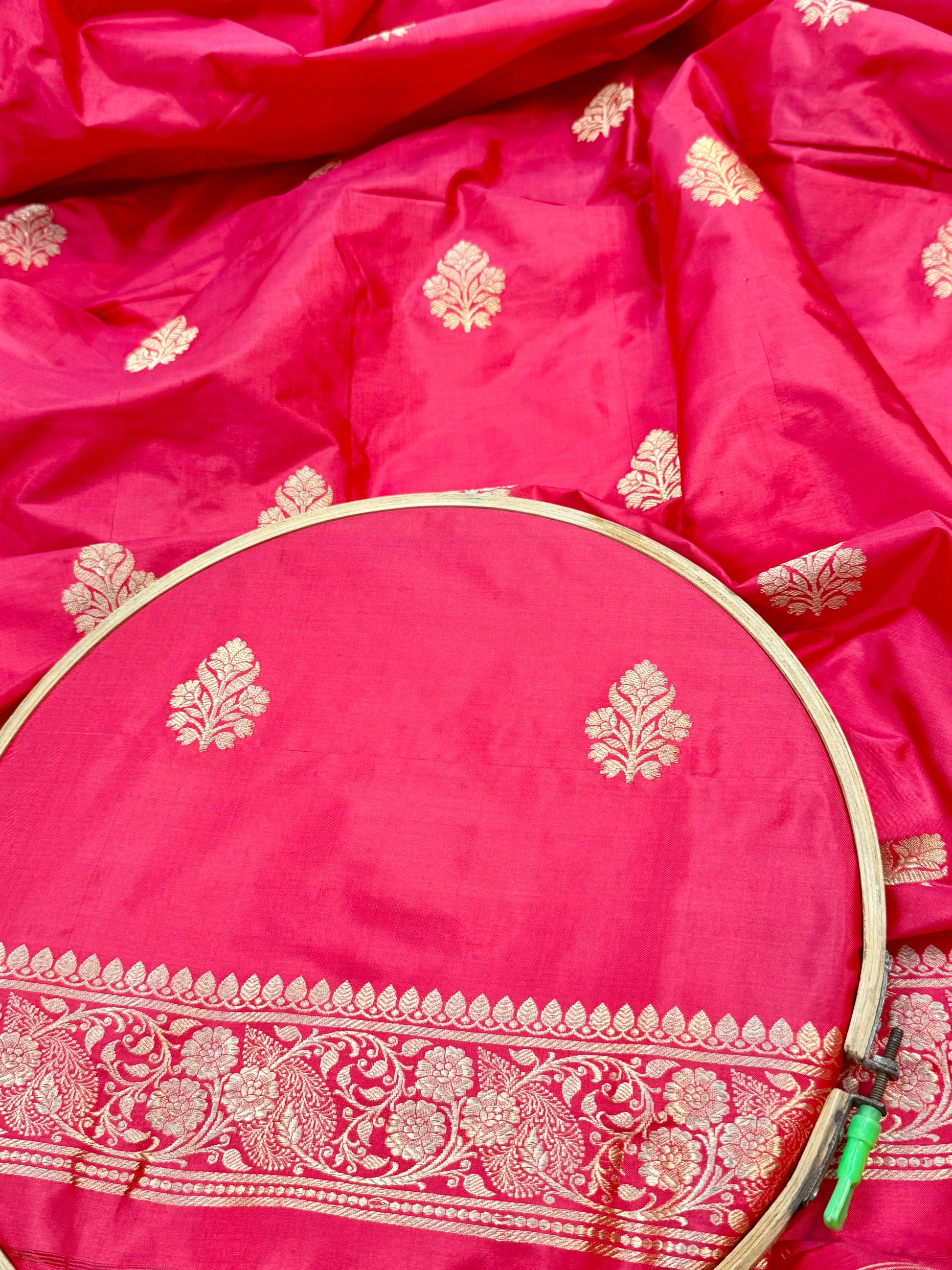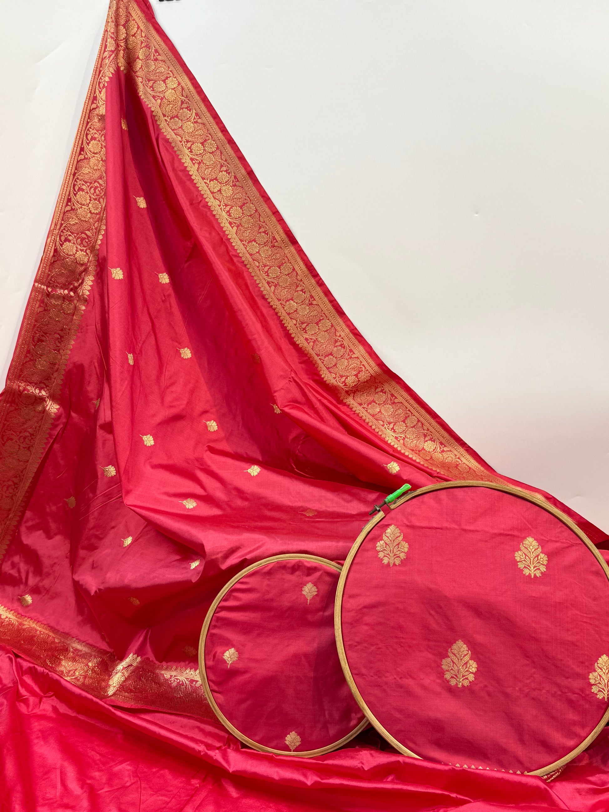 Handwoven in Banaras, this Stowberry color Katan Suit piece is a canvas waiting for your imagination.
