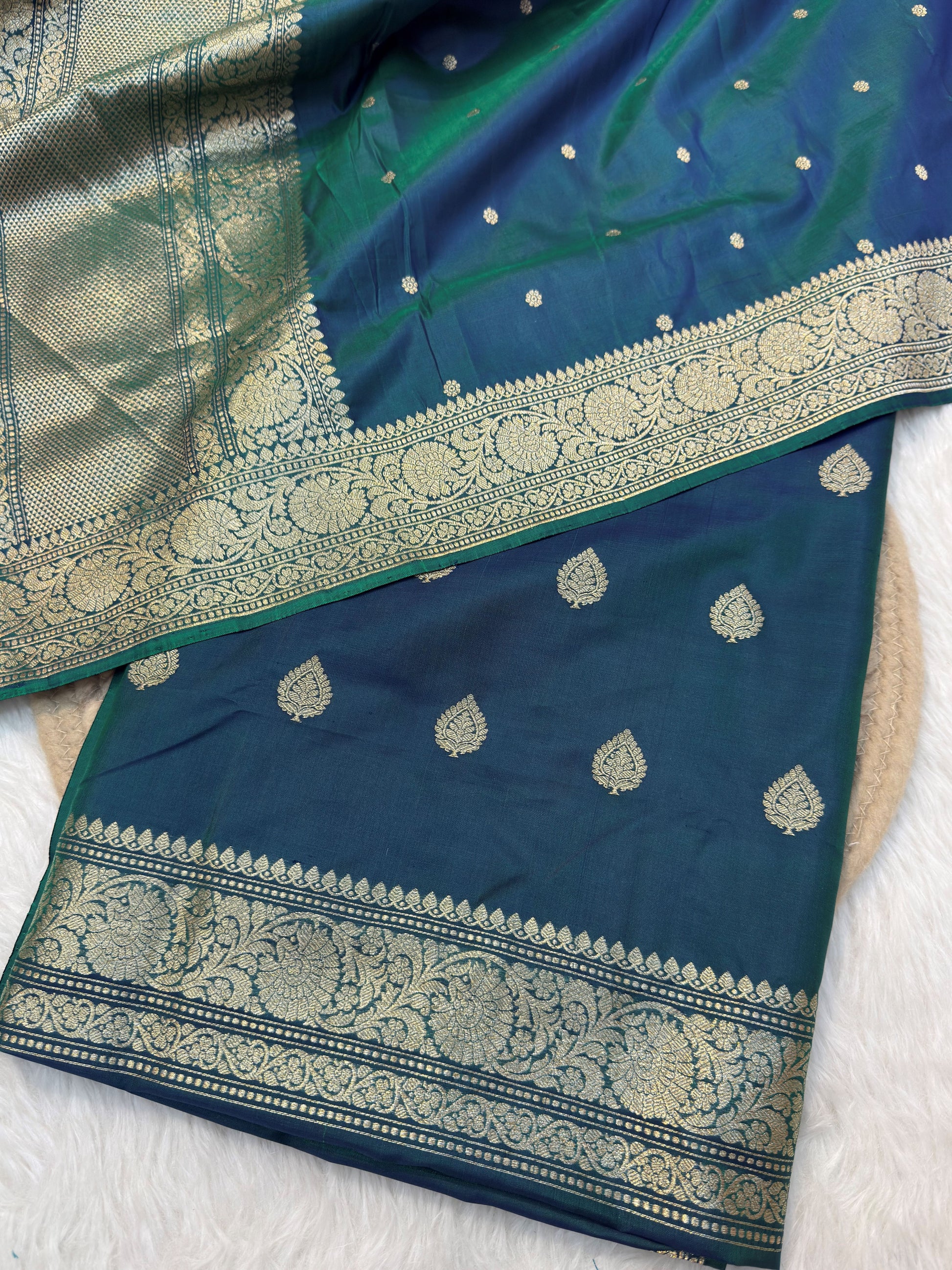 Handwoven in Banaras, this Peacock blue colour Katan Suit piece is a canvas waiting for your imagination.